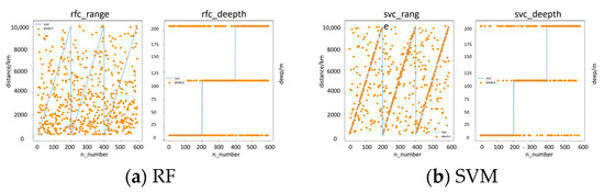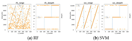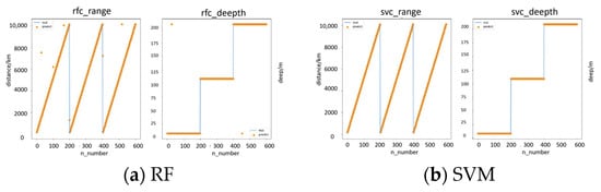 The classification output of 2D localization consists of two arrays. One array is the predicted output label in the distance dimension, and the other array is the predicted output label in the depth dimension, which belongs to a multi-output classification problem. Figure 8 shows the multi-output classification results of the two algorithms (RF and SVM) when the SNR is 2. In multi-output classification, the prediction accuracy of the same distance dimension is lower than that of the distance dimension prediction in 1D localization. Because there are three classifications in depth dimensions and many training samples, even if the SNR is not high, the localization effect is still good. In Figure 9, the 2D localization effects of the two machine learning models with a SNR of 5 are shown. When the SNR is improved, the prediction results of the SVM have been significantly improved, the accuracy of the distance localization of the RF model has also slightly improved, and the number of outliers has decreased. When the SNR increased to 10, the multi-output classification accuracy of both models was significantly improved. There were no obvious outliers and the localization effect was good (see Figure 10), which could well fit the actual position of the simulated acoustic source.
