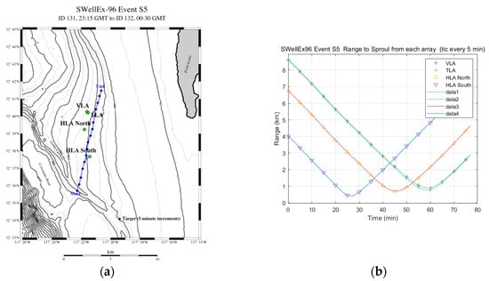 The experimental environment and the distance between the acoustic source and the array. (a) The travel trajectory and array position of the acoustic source of the S5 event. (b) The distance of the acoustic source from each detector every 5 min.