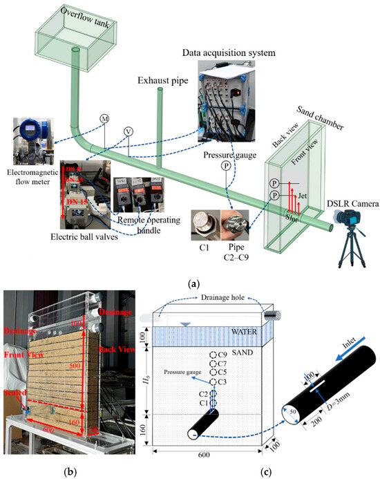 Experimental setup: (a) schematic of the experimental setup (not to scale); (b) sand chamber (unit: mm); (c) water supply pipe buried in the sand chamber (not to scale, unit: mm).