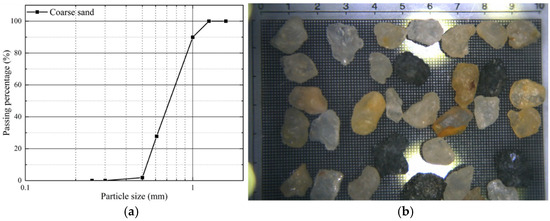 Coarse sands were screened from Fujian standard sands and utilized to fill the chamber as the backfill material during the experiment. The particle size distribution curve is presented in Figure 2a, and the physical properties are listed in Table 1. The particle size distribution was determined following ASTM D422-63 [37], and the specific gravity was measured based on ASTM D854-23 [38]. Based on ASTM standard D2487-17 [39], the sand is classified as “SP,” indicating it behaves as an isotropic and homogeneous material. The permeability coefficient (k) and the angle of repose (φ) were measured using the constant head method and direct shear test, respectively. These tests were conducted at a porosity (n) of 0.4. The maximum porosity (nmax) was determined using the vibratory table method based on ASTM D4253-16 [40], while the minimum porosity (nmin) was measured using the free fall method following ASTM D4254-16 [41]. A microscopic image of the sand particles is shown in Figure 2b. Most particles appear angular, and the friction between them must be carefully considered in the analysis.