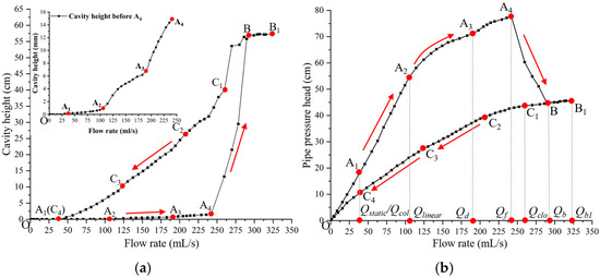 Figure 3 illustrates the variation in cavity height and pipe pressure during the fluidization and defluidization processes. All pressure gauge readings are shown in centimeters. The pressure head along the vertical axis was calculated by subtracting the initial hydrostatic pressure from the measured gauge values. This calculation accounts for the velocity head, which is generally negligible in most cases. The progression O–A1–A2–A3–A4–B–B1 in Figure 3a denotes the fluidization process, while the reverse sequence B1–C1–C2–C3–C4–O corresponds to the defluidization process. The corresponding pipe pressure head for both stages is shown in Figure 3b.