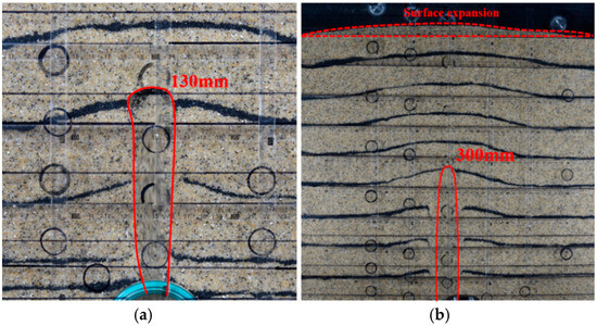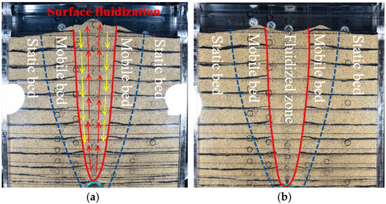 The fluidized zone can be categorized into three regions by tracking the movement of black sand: the static bed zone, mobile bed zone, and fluidized zone, as shown in Figure 6. Sand particles remain stationary and tightly packed in the static zone, whereas in the fluidized zone, particles are fully fluidized, forming a particle flow. The mobile zone lies between the static and fluidized zones, where particles move within a limited range. The slip surface is defined as the interface between the mobile zone and static zone. Figure 6a shows that the fluidized zone can be further subdivided into two parts:
