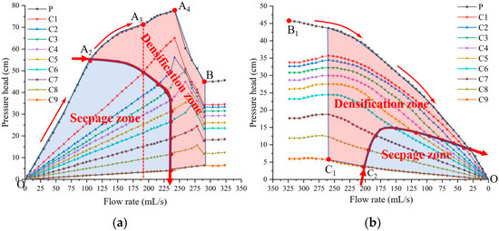 Figure 7a,b illustrate the changes in pipe pressure (P) and internal sand bed pressures at points C1 to C9, respectively. Red points on each pressure curve mark the transition between the linear (seepage) and nonlinear (densification) phases. Connecting these points yields a densification curve that separates the seepage zone from the densification zone. The arrows along the curve indicate the direction of densification during the fluidization and defluidization processes. During fluidization, densification proceeds from the orifice upward to the surface. The onset of fluidization at point A4 occurs when the porosity of the densified region above the localized cavity reaches a critical threshold, approximately equal to the minimum porosity. Internal fluidization refers to the process in which the sand layer above the fluidized cavity is compressed to a critical porosity value near the minimum and then expands. In this process, the pressure curve exhibits a sudden increase followed by a rapid decrease from points C1 to C9. During defluidization, the sand bed densifies in the opposite direction, from the surface downward to the orifice. Due to the hysteresis effect shown in Figure 3a, the tangent of the direction curve in Figure 7a is smoother than that in Figure 7b.