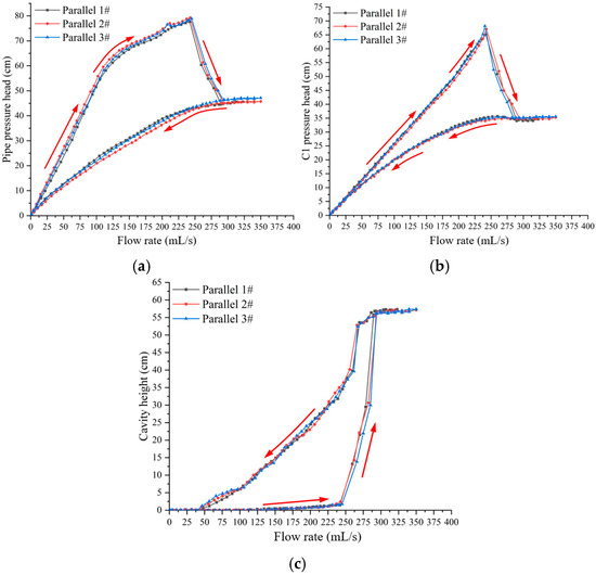 Figure 8a–c present the results of three parallel experiments (1#, 2#, and 3#), highlighting the pipe pressure (hp), pressure at C1 (hC1), and the height of the cavity (Hc), respectively. These parameters were selected because hp and hC1 exhibit noticeable fluctuations due to complex flow conditions, whereas Hc is essential for accurately determining head loss. The results indicate that the relative errors for hp, hC1, and Hc are below 5%, demonstrating good experimental repeatability.