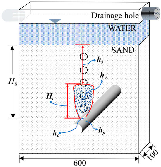 The experimental setup employed to simulate sand fluidization and defluidization caused by a leaking pipe is illustrated in Figure 1a. It primarily comprised a sand chamber, a water supply pipe, and an inflow rate control system. Figure 1b shows a photograph of the plexiglass sand chamber, which measures 600 × 100 × 1000 mm (length × width × height), with a wall thickness of 20 mm. Several orifices were created along the sidewalls to maintain a constant water level within the chamber. The water supply pipe featured an inner diameter of 50 mm and a wall thickness of 5 mm. It was partially embedded in the sand chamber, positioned 160 mm above the bottom, and sealed at the pipe’s end. A narrow slot measuring 3 mm in width and 100 mm in length (matching the width of the chamber) was cut into the pipe as the leakage point, as shown in Figure 1c, discharging a vertically upward jet along the chamber’s longitudinal section. Because of the aspect ratio exceeds 30, the narrow slot can be simulated as a two-dimensional slot. Since the chamber’s length was 10 times the pipe’s diameter, boundary effects were considered negligible. Sand particles were added to the chamber to reach the desired sand layer height. This experimental configuration simplified the scenario into a two-dimensional jet and plane strain condition for the contained sand particles [35,36].