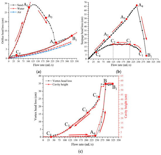 Figure 10c shows that vortex head loss increases sharply during the internal fluidization stage from A4 to B. However, during the surface fluidization stage (B–B1 and B1–C1), vortex head loss remains nearly constant despite changes in flow rate. The trend in vortex head loss is closely consistent with the changes in cavity height. This indicates that vortex head loss can be highly related to the variation of the fluidized cavity height. Specifically, the rate of cavity collapse follows the order C1–C2 > C2–C3 > C3–C4.