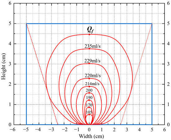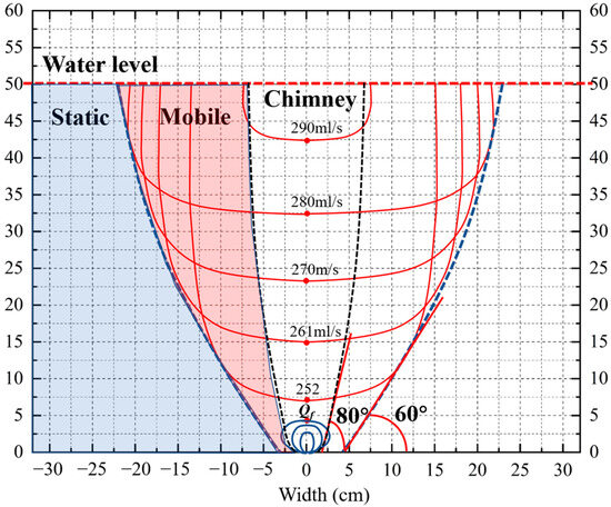The displacement field of the sand bed was measured by tracking the movement of black sand particles. Based on this, the shape of the slip surface was analyzed through the deformation observed during the fluidization process. The sand bed fluidization pattern can be reflected by the change of the slip surface. Figure 11 shows the changes in the slip surface (indicated by the red line) during static bed stage before Qf. The numbers shown above the red contour lines correspond to different water flow rates. The critical fluidization flow rate, Qf, represents the point at which the shape of the slip surface begins to change. When the flow rate remains below Qf, the slip surface expands outward in a radial direction. This expansion occurs more rapidly along the centerline than at the edges, as shown in Figure 11. The radial expansion is induced by a point source jet. Several CFD-DEM simulations have observed similar circular or ellipse pressure field and confirmed the presence of a radial flow distribution [48,49,50]. The scope of the radial expansion is confined by the initial porosity of the sand bed. In this experiment, the initial porosity is close to its minimum, resulting in a small expansion zone, which is confined to a 5 cm × 5 cm square above the orifice.