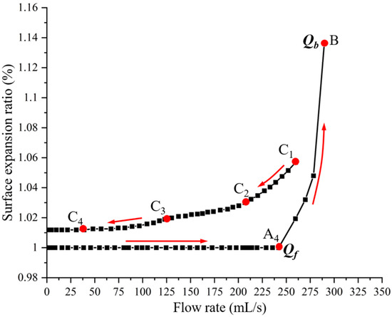 During the A4–B stage, the height of the fluidized cavity rises rapidly, and the pipe pressure drops sharply. Point A4 signifies the transition from a static state to internal fluidization. The water flow rate at this point is defined as Qf. Following the internal fluidization stage, the B–C1 stage corresponds to the surface fluidization stage, comprising the B–B1 phase from the fluidization process and the B1–C1 phase from the defluidization process. Point B denotes the transition from internal fluidization to surface fluidization, and the water flow rate at this point is defined as Qb. During this stage, both the height of the fluidized cavity and the pipe pressure remain nearly constant. Point C1 indicates a sudden drop in cavity height attributed to the cessation of surface fluidization; hence, the flow rate at point C1 is defined as Qclo. During the C1–C4 stage, the defluidized cavities behave similarly to those observed in the A4–B stage, which is classified as the internal defluidization stage. Finally, in the C4–O stage, defluidized cavities vanish, and the sand bed returns to a static state. At this point, the sand layer near the orifice collapses. Point C4 represents the critical point of this localized collapse, and the flow rate at this point is defined as Qcol. Figure 3 shows that both cavity height and pipe pressure exhibit nonlinear variation throughout the defluidization process.