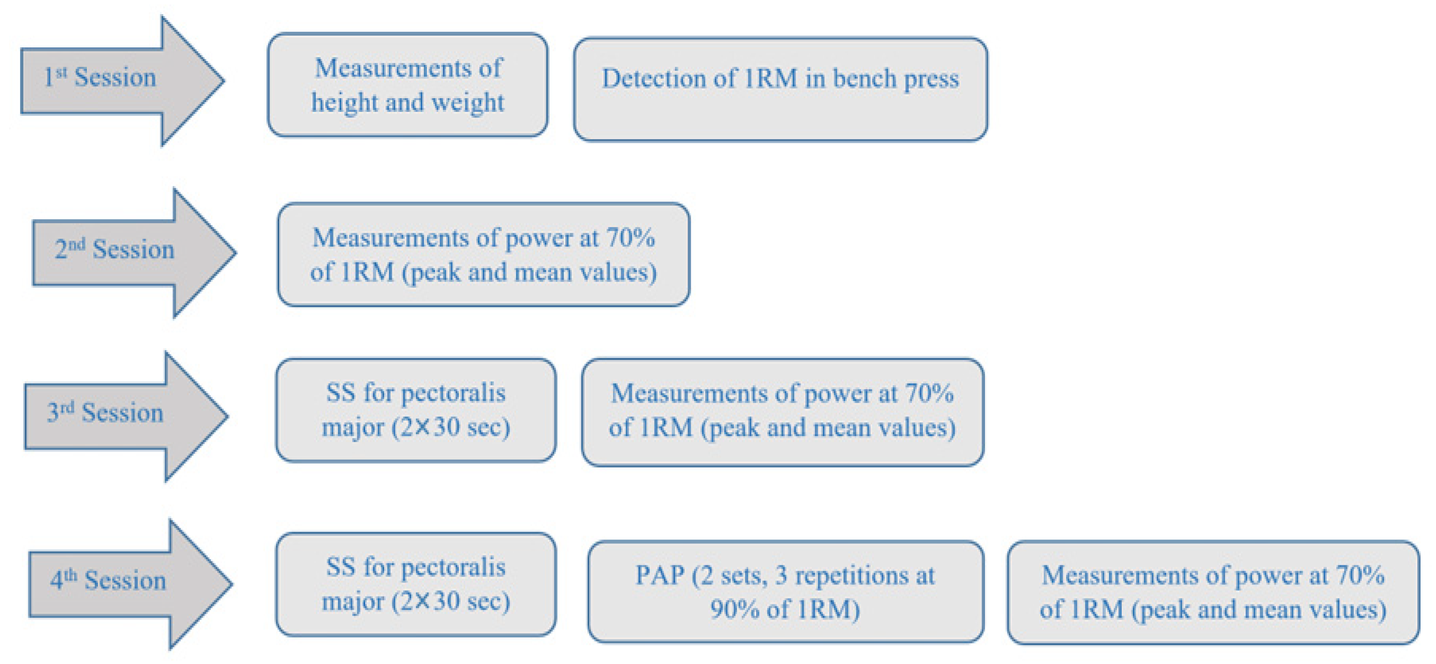 Session 4 (Post-SS + PAP Performance): Following the standardized warm-up and specific bench press warm-up, participants first performed the same SS protocol (2 × 30 s). This was immediately followed by the PAP conditioning activity: 2 sets of 3 repetitions of bench press exercise at 90% of their 1RM, with 2–3 min rest between sets. After a standardized 5 min PAP rest period following this heavy stimulus, participants performed the performance measurement—bench press repetitions at 70% 1RM—and peak and mean power were measured again using the same analysis method as in Session 2.