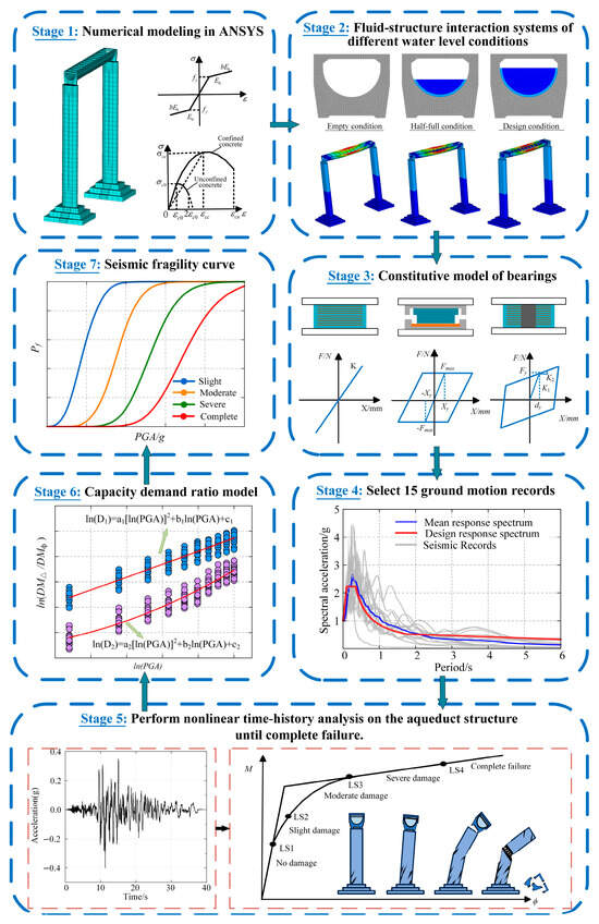 The irregular geographical and temporal allocation of water resources is a significant factor contributing to water shortage in dry parts of China. Many inter-basin water transfer projects have been set up across the country to help with the problems that come with not having enough water and to encourage long-term growth in these areas [1]. Among them, aqueducts play an important part as crucial hydraulic structures within such projects. They perform numerous purposes, including water diversion, conveyance and distribution, which helps to ensure that water transfer systems continue to work in a steady manner [2]. However, numerous critical water transfer projects are required to traverse high-seismic-intensity regions, which present obstacles due to intricate geological conditions [3]. Aqueducts have inadequate seismic performance during intense earthquakes due to structural attributes, such as a high center of gravity and unequal stiffness distribution, rendering them susceptible to damage and resulting in complex and expensive post-earthquake repairs. Consequently, examining the seismic performance of aqueduct constructions has considerable theoretical and practical significance [4,5,6]. Although these studies provide the theoretical groundwork for aqueducts to safely operate, they often overlook many failure dangers that might occur under complex earthquake situations [7]. Seismic fragility theory assesses the risk of structural collapse using probabilistic approaches by measuring the probability that a structure would attain or surpass a defined damage state at varying levels of seismic [8,9,10]. The performance of seismic fragility analysis on aqueduct structures provides essential theoretical foundations for the improvement of their seismic design and the development of effective post-earthquake repair strategies. The safety and resilience of water transfer projects in regions with significant seismic activity are, therefore, improved as a result of this.