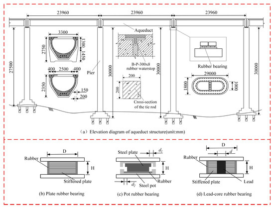 Schematic diagram of the aqueduct structure (units: mm): (a) Elevation diagram of aqueduct structure; (b) Plate rubber bearing; (c) Pot rubber bearing; (d) Lead-core rubber bearing.