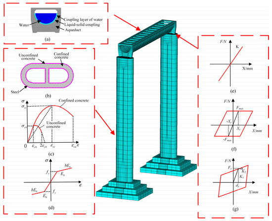 Finite element model of aqueduct structure: (a) fluid–structure coupling schematic; (b) fiber section of aqueduct pier; (c) constitutive model of concrete; (d) constitutive model of reinforcement; (e) plate rubber bearing; (f) pot rubber bearing; (g) lead-core rubber bearing.