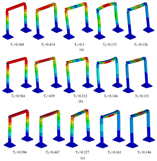 Mode frequency analysis serves as the foundation for the dynamic time–history analysis of aqueduct structures, delineating their intrinsic vibrational characteristics in the absence of external stimuli. The elevated long-span aqueduct in the practical engineering case examined in this study is supported by plate rubber bearings. Consequently, the plate rubber bearing model was chosen as the primary analysis object in the modal analysis and the natural vibration characteristics were examined under three operating conditions: empty, half-full and design water level conditions. The cumulative effective mass in each direction must exceed 90% of the total structural mass, as stipulated in the Code for Seismic Design of Buildings (GB 50011-2010) [32]. The study’s cumulative mass participation rates for the first ten modes in the x, y and z directions all exceed 90%, indicating that there are enough extracted modes, as shown in Table 5. Figure 4 presents the lower-order vibration modes of the aqueduct structure. Overall longitudinal translation is exhibited by the aqueduct structure’s first mode, overall transverse translation by its second and transverse staggered rotation by its third.