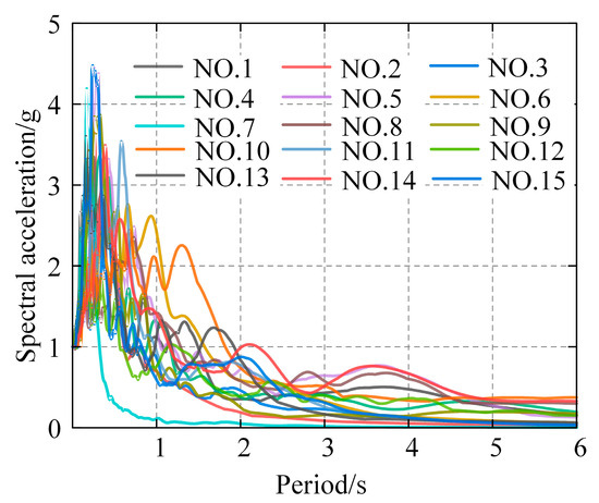 Seismic fragility analysis necessitates the selection of a sufficient quantity of ground motion recordings to effectively address the uncertainty of ground movements. For the incremental dynamic analysis approach, the selection of 10 to 20 ground motion data is enough to fulfill the accuracy criteria for the analysis [35]. The aqueduct engineering site is classified as a Type II site, with a soil shear wave velocity between 250 and 500 m/s and a seismic fortification intensity of 7.5. The target response spectrum is determined per the Code for Seismic Design of Hydraulic Structures (GB 51247-2018) [23]. Fifteen seismic ground motion records were extracted from the Pacific Earthquake Engineering Research (PEER) database, with the findings illustrated in Figure 5. The target response spectrum was compared to the mean response spectrum of the selected ground motions, and a satisfactory fit was observed. The peak ground acceleration (PGA) was used as the seismic intensity metric, and the PGA of the 15 ground motion records was scaled tenfold across a spectrum of 0.1 g to 1.0 g, resulting in a total of 150 seismic ground motion samples. The corresponding vibration response data for each ground motion were extracted by sequentially inputting these 150 samples into the finite element model along the transverse direction of the aqueduct.