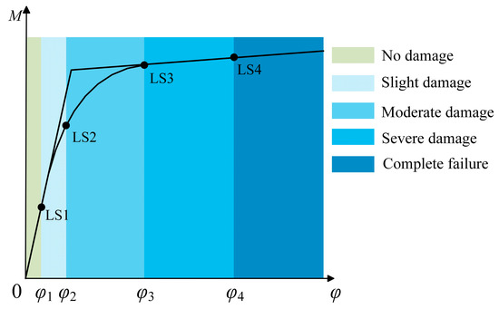 The critical values of the damage measure can be determined by utilizing the moment-curvature (P-M-φ) analysis of reinforced concrete sections in X-TRACT software (https://www.xtract.app/, accessed on 4 August 2025), as illustrated in Figure 6. Table 6 provides specific results.