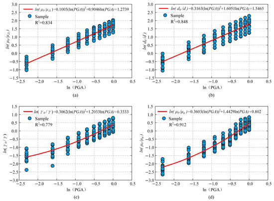 where λ signifies the logarithmic mean of the capacity–demand ratio; σ indicates the logarithmic standard deviation of the capacity demand ratio; IM denotes the seismic intensity measure. Sr represents the summation of squared residuals of the sample points; N is the sufficient number of sample points; and a, b, c are the parameters of the regression equation.
