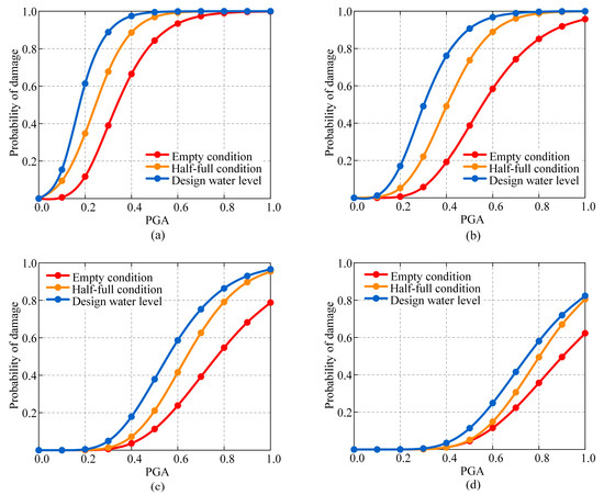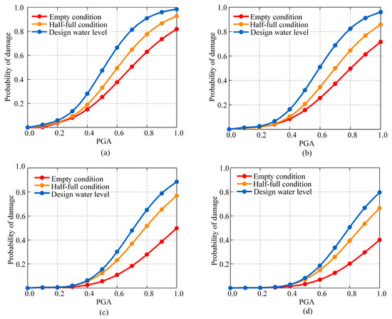 At the design water level, with a peak ground acceleration of 0.5 g, the exceedance probabilities for plate rubber bearings are 99.48% for slight damage, 90.68% for moderate damage, 37.89% for severe damage and 11.42% for complete damage. Conversely, in the half-full conditions, the exceedance probabilities for these damage states are 96.88%, 73.73%, 21.11% and 5.15%, indicating decreases of 2.60%, 16.95%, 16.78% and 6.27%, respectively. In the empty conditions, the probabilities are 84.35%, 38.71%, 11.31% and 4.49%, which equate to decreases of 15.13%, 51.97%, 26.59% and 6.93%, respectively. The results demonstrate that at the design water level, the damage exceedance probabilities of plate rubber bearings are more sensitive to increasing PGA, especially for slight and moderate damage states, where they are considerably higher than under half-full and empty conditions.