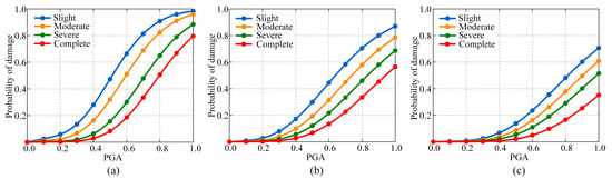 Seismic fragility curves of thin-walled hollow piers with different bearing types under the design water level: (a) plate rubber bearing; (b) pot rubber bearing; (c) lead-core rubber bearing.