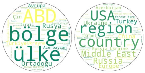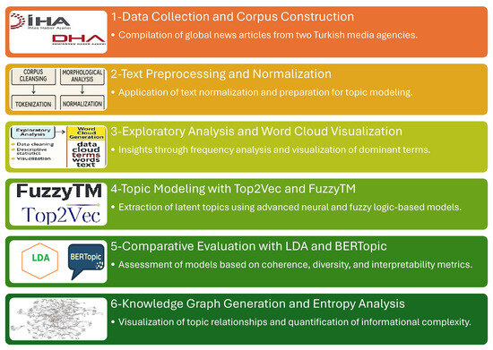 Figure 1. Data collection and corpus construction involve the compilation of global news articles from two major Turkish media agencies, ensuring internationally relevant discourse. The text preprocessing and normalization phase prepares the raw textual data through tokenization, lowercasing, stopword removal, lemmatization, and stemming, optimizing it for topic modeling algorithms. Exploratory analysis and word cloud visualization are performed to generate initial insights into term frequencies and highlight dominant lexical patterns across the corpus. Topic modeling is conducted using Top2Vec and FuzzyTM, two advanced models that leverage neural embeddings and fuzzy logic, respectively, to extract latent semantic structures without requiring a predefined number of topics. The performance of these models is evaluated against conventional approaches—specifically LDA and BERTopic—using quantitative metrics such as coherence, diversity, and an interpretability score derived from their product. Knowledge graphs are generated to visually represent topic interconnectivity, and entropy analysis is applied to quantify the structural complexity of the resulting semantic networks. This integrated framework enables both a rigorous computational comparison and a deeper understanding of how different modeling paradigms reveal thematic content in morphologically rich, multilingual settings. The complete analysis is presented with its corresponding English translations.
