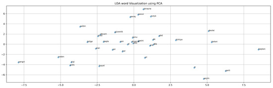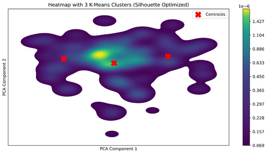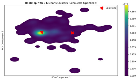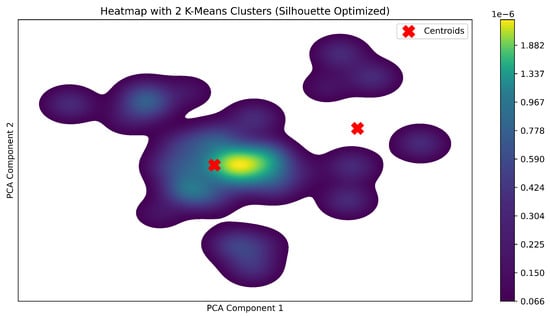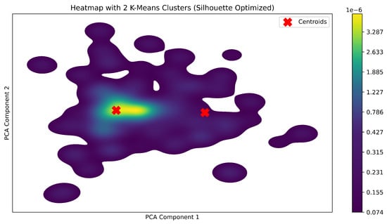 Figure 6 shows the heatmap of LDA’s topic projections. Visually, a dense and slightly elongated central region is observed, with the presence of two distinct centroids represented by red markers. The color intensity in the heatmap reflects the areas of highest topic projection density. K-means analysis, enhanced by silhouette analysis, identified two clusters for LDA. The centroids are positioned within the densest regions, indicating that LDA was able to identify two primary and well-defined topic groups. The visible overlap in the central region of the heatmap may suggest some semantic proximity or shared vocabulary between these two broad topic groups. The probabilistic nature of LDA, where topics are distributions over words and documents are distributions over topics, is reflected in this PCA projection, which visualizes the relationships between these topic distributions. The elongated central region and the overlap indicate that, while two clusters are optimal, the topics identified by LDA may not be entirely orthogonal or mutually exclusive. This can be attributed to the polysemy inherent in natural language or to the probabilistic nature of LDA, where documents can belong to multiple topics, creating a semantic gradient between the identified groups.