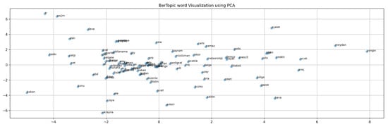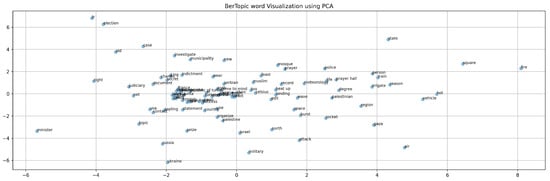 Figure 9 shows the heatmap of topic projections. Its visual appearance is remarkably similar to LDA in terms of centroid density and positioning. BERTopic also resulted in two silhouette-optimized k-means clusters. The visual similarity with the LDA projection suggests that, despite BERTopic’s distinct methodology—which relies on document embeddings, dimensionality reduction via UMAP, HDBSCAN clustering, and topic representation via c-TF-IDF—its final topic representations, when projected via PCA, converge to a similar bipartite structure. This convergence is a significant finding, as it implies that the dominant semantic divisions in the dataset are robust enough to be captured by diverse topic modeling paradigms. Both models, through their distinct paths, converge to the same topic organization at a macro level.