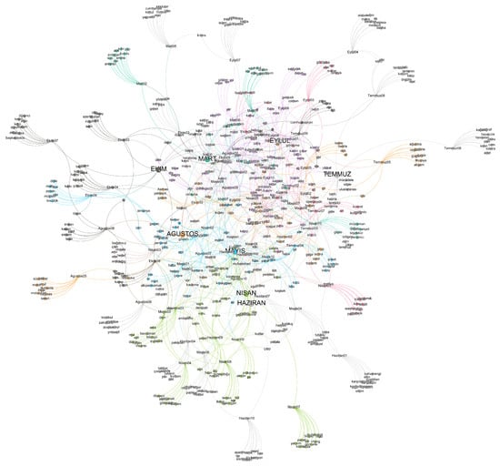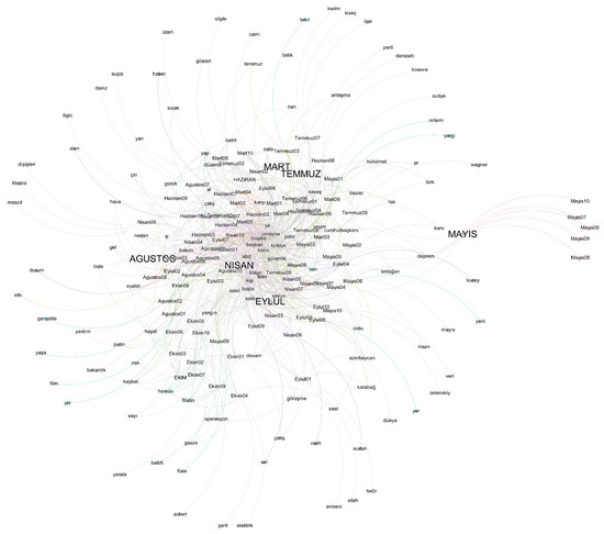 The topic modeling results for the LDA method, despite showing lower coherence (0.27) and interpretability (0.095) compared to other methods, reflect a broad thematic diversity that aligns with prominent geopolitical and regional issues in news media over the analyzed months. Across March to October, topics consistently centered on major international relations themes such as the Russia–Ukraine conflict, US foreign policy, Middle Eastern security dynamics, and domestic political developments. Notably, frequent co-occurrences of keywords like “Russia,” “Ukraine,” “US,” “Israel,” and “Turkey” indicate the salience of international conflicts and diplomatic affairs in the news discourse, while terms such as “attack,” “security,” “president,” and “region” underscore ongoing concerns about military actions and governance. The monthly topic clusters reveal a nuanced temporal progression of news focus. For instance, in March and April, the prevalence of keywords related to geopolitical tensions and security issues—such as “Iran,” “Israel,” “safety,” and “demonstration”—reflects a focus on regional instability and conflict outbreaks. Moving into May and June, there is a noticeable inclusion of domestic political terminology alongside ongoing war-related vocabulary, with terms like “president” and ”election” emerging, indicating an intertwining of international and national political coverage. The summer months continue to emphasize “NATO”, “defense”, and security topics, while also introducing environmental and social issues in the Mediterranean zone such as “fire” and “heat”, particularly in July and August, suggesting a diversification of news themes beyond purely political-military events. In the later months, especially September and October, the topic clusters increasingly highlight the escalating Israeli–Palestinian conflict by reflecting a shift in news focus towards “Middle East”. Additionally, topics involving “Azerbaijan”, “Armenia”, and “Karabakh” suggest regional conflict awareness remains important. Although the LDA-generated topics may exhibit lower coherence scores, the presence of diverse yet thematically coherent clusters demonstrates that the method captures a wide array of key political, security, and social issues dominating media narratives throughout the period.