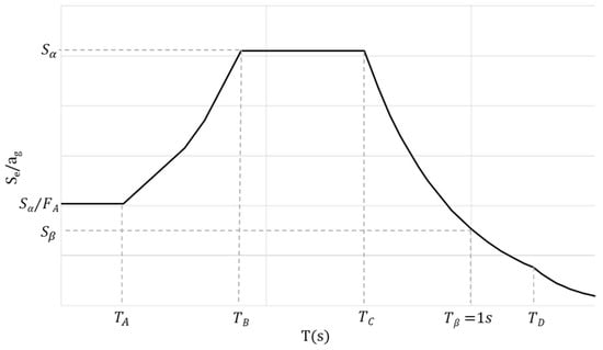 New-generation spectra are still provided in the form of pseudo-absolute acceleration response spectra. However, new spectra are anchored with two parameters, as opposed to the current norm of representing the spectra with a single parameter, peak ground acceleration (PGA). The first parameter is the spectrum value at the plateau Sα, and the second parameter is the spectrum value Sβ, which anchors the value for a period of 1 s (Equations (2) and (3)).