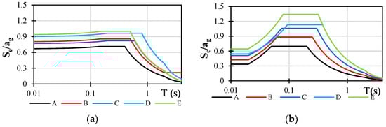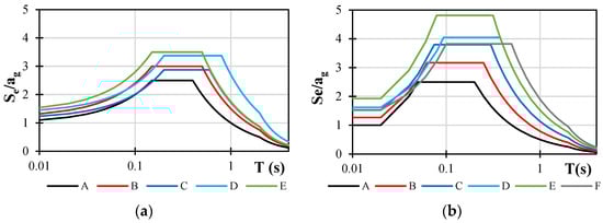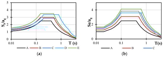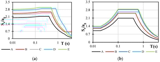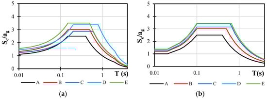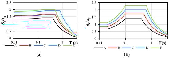 In order to determine the difference in elastic spectra according to the new generation and currently valid EN 1998-1-1 norm, spectra for all site categories were constructed and are shown in Figure 2a,b. For the currently valid spectra (Figure 2a, Figure 3a and Figure 4a), spectra were constructed for ag = 1, 2, and 3 m/s2, and for the new-generation spectra (Figure 2a, Figure 3a and Figure 4a), they were constructed for spectral ordinates Sα = 2.5; 5.0; 7.5 m/s2. It is proposed that Sα values will be close to 2.5 ag.