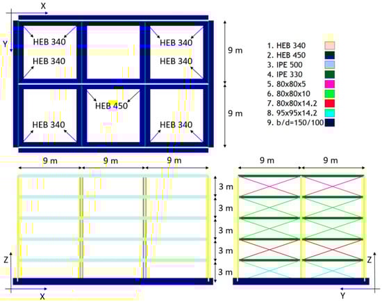 The case-study building is a five-storey steel residential building composed of three-bay frames spaced at nine meters as shown in Figure 9. Moment-resisting frames are spaced in the longitudinal direction, and braced frames are spaced in the transverse direction. The structure is located in Europe and founded on a rock site (soil type A according to Eurocode 8 []). The seismic characterization is based on a single parameter, the peak ground acceleration (PGA), which is assumed as 0.3 g. The design was performed according to European provisions (i.e., Eurocodes 3 [], 4 [], and 8 []). European steel cross-sections were adopted for the columns (HEB) and for the beams (IPE). All elements were made of steel grade S275.