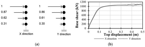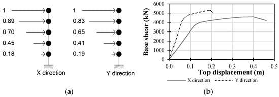 Vertical distribution of lateral forces for pushover analysis (a) and capacity curves for X and Y (b) directions.
