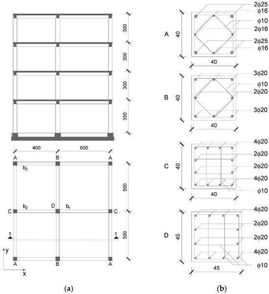 (a) The four-storey reinforced concrete structure (dimensions in cm); (b) reinforcement of columns (dimensions in cm) at the base [].