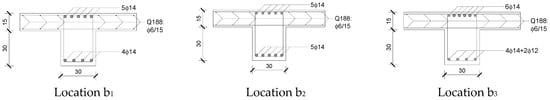 Typical reinforcement in beams (dimensions in cm) in first storey: location b1, location b2, and location b3 [].