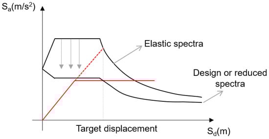 The N2 method commences with the definition of the multi-degree-of-freedom (MDOF) system. The pushover analysis is the subsequent step, which involves the application of a monotonically increasing load to the nonlinear MDOF system to establish the building’s force–displacement relationship. The capacity curve of the building is also referred to as the force–displacement relationship. The target displacement, which is considered to represent the seismic demand on the structure, is determined using the capacity curve. The target displacement is determined by overlapping the capacity curve of the building and the designed spectra for the acquired seismic load. Equation (4) is employed to establish a connection between spectral acceleration Sa and spectral displacement Sd.