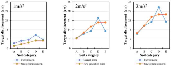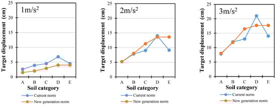 Target displacement was determined for three different peak ground acceleration levels: 1 m/s2, 2 m/s2, and 3 m/s2. Displacement was compared (Figure 15, Figure 16 and Figure 17) for different soil types and also for when the new generation of EN 1998-1-1 was used as well as the currently valid EN 1998-1-1 norm.
