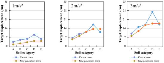 - When the current standard was implemented for all soil types and all three building types, the target displacement for an acceleration of 1 m/s2 was generally higher. The largest disparities occurred for soil types A, B, and D, ranging from 41% to 61%. For accelerations of 2 m/s2 and 3 m/s2, steel buildings showed nearly identical target displacements across soils, while RC-framed buildings showed values approximately 20% higher for soils A and B. Only soils C and E exhibited significantly higher target displacement values—up to 50%—for steel buildings; RC frames remained almost unaffected.