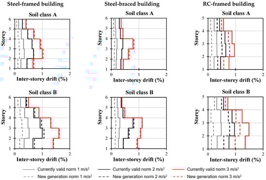 Soil classes A and B are the only ones depicted in Figure 18 for three building types and for ground accelerations that increase incrementally. The grey-coloured lines illustrate the initial distinctions in inter-storey drifts. Solid lines denote inter-storey drifts in accordance with the current valid norm, while dashed lines denote the results for the new generation of the norm. The distribution of drift for soil types A and B is consistent in the majority of cases. The maximum drifts are observed in the second storey of both framed structures and in the third storey of the braced frames.