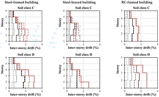 Complete information regarding the building state cannot be obtained from the previously studied target displacement. Consequently, Figure 18 and Figure 19 illustrate the distribution and comparison of inter-storey drifts for each target displacement, which is divided by soil type and level of acceleration. In order to evaluate the impact of various spectra on various structural systems, inter-storey drifts are presented for three types of structures: steel moment-resisting frames, steel braced frames, and RC frames. Braced frames exhibit behaviour that is comparable to that of shear walls, while moment-resisting frames function exclusively as frames.