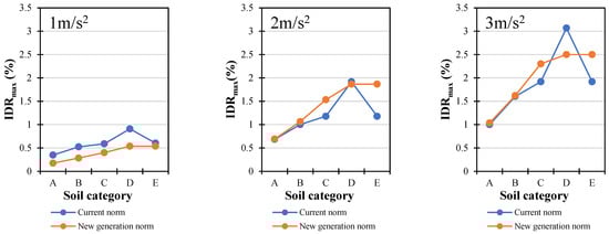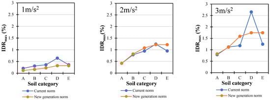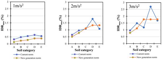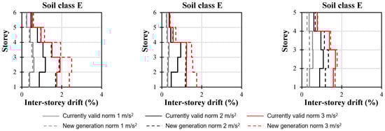 The maximum inter-storey drifts are compared in Figure 20, Figure 21 and Figure 22. The application of the new-generation norm spectra resulted in an average of 46% lower values of inter-storey drift for ground acceleration values as low as 1 m/s2. According to their drift values and performance levels, this disparity is not negligible. It appears that the same building, under identical conditions, will exhibit a “better” or more acceptable performance level in accordance with the new-generation norm []. In all three cases, the performance level of the various building types varied from limited safety to severe collapse, with the largest differences being primarily attributed to soil type D for larger values of ground acceleration (3 m/s2).