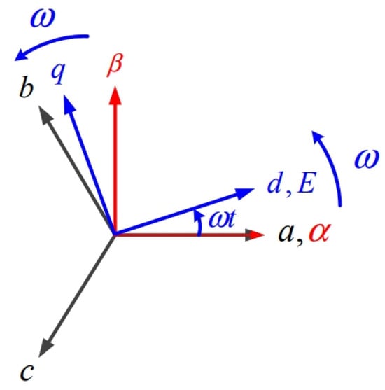 To reduce the analytical complexity and to design controllers in a decoupled fashion, the three-phase variables in the stationary frame are mapped first onto the stationary frame (Clarke transformation) and then onto the synchronously rotating frame (Park transformation), as illustrated in Figure 2.