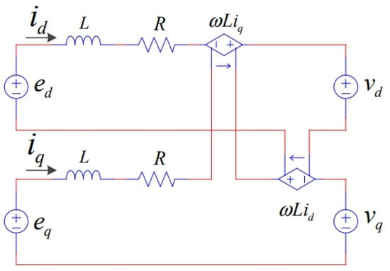 The coupling terms arise from the rotational transformation and explicitly appear as back-EMF-like components in the model. Figure 3 depicts the equivalent circuit, making the cross-coupling channels evident.