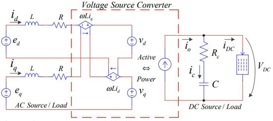Figure 5 gathers the AC-side model and the DC-link into a single averaged representation of the voltage-source converter (VSC), highlighting the flow of active power from the AC terminals to the DC port.