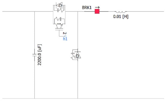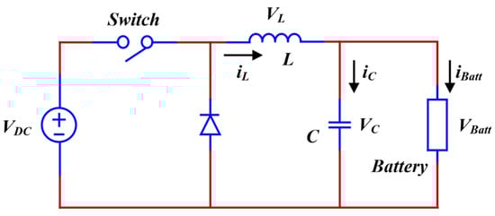 In the DC–DC stage, a step-down (buck) converter regulates the battery terminal through an output filter, as depicted in Figure 7. With the input and the switch duty ratio , the averaged output voltage in continuous-conduction mode satisfies