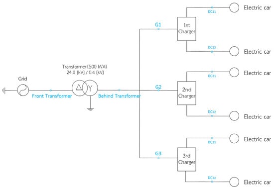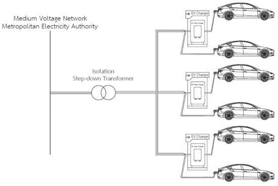 As depicted in Figure 8, the station is connected to the medium-voltage (MV) distribution network of the Metropolitan Electricity Authority (MEA) through an isolation step-down transformer, which reduces the voltage from 24 kV to 400 V, suitable for EV chargers. Each charger then converts AC to DC to deliver fast charging directly to EV batteries. The station was simulated using power flow analysis and transient load modeling using PSCAD/EMTDC. The following aspects were assessed: