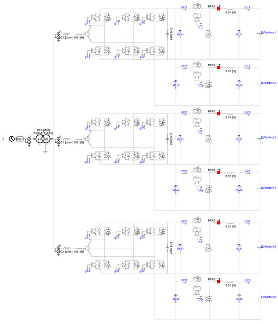 To evaluate the dynamic behavior and power-quality impacts of EV fast charging on distribution systems, we developed a comprehensive PSCAD/EMTDC model that integrates all critical subsystems of an EV-charging station and emulates realistic operating and control characteristics (as illustrated in Figure 9). The system is supplied from a 24-kV medium-voltage (MV) distribution network representative of a typical urban grid managed by the Metropolitan Electricity Authority (MEA) and stepped down to 400 V low voltage (LV) through a dedicated 500 kVA Δ–Y step-down transformer, which also provides galvanic isolation to enhance safety and attenuate the propagation of harmonics toward the upstream grid while supporting voltage stability during transient loading. The station architecture is modular, comprising three independent charging units; each unit can charge two EVs simultaneously via separate AC–DC and DC–DC conversion stages, enabling concurrent fast charging of up to six EVs. This model enables detailed analysis of grid–charger interactions under high-demand fast-charging conditions.