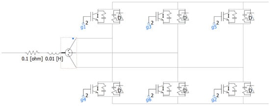Each charging unit incorporates a three-phase voltage source inverter (VSI), implemented with six insulated gate bipolar transistors (IGBTs) configured in a full-bridge topology (Figure 10). The inverter converts three-phase AC power to DC, while series inductors (0.01 H) and resistors (0.1 Ω) are integrated to filter high-frequency switching harmonics and improve output power quality. This inverter stage serves as the front end of the charging system and interfaces with downstream control modules.