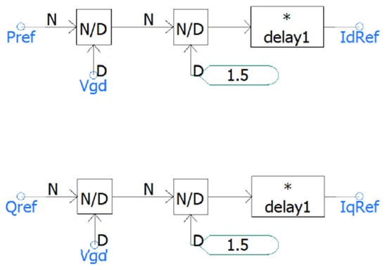 Active and reactive power conversion to dq reference currents. * = product/multiplier. It multiplies its inputs or multiplies a signal by the labeled constant.