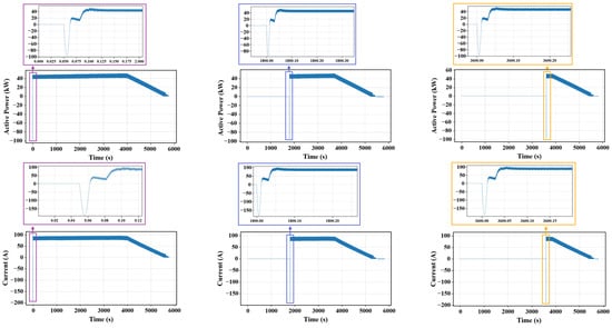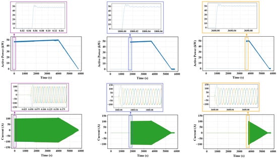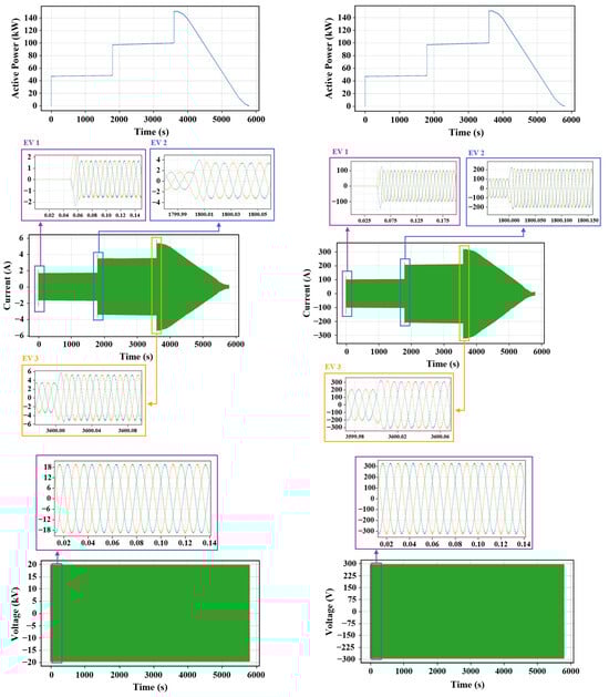 For unit G1 in Figure 16a, active power starts at 50 kW as EV1 connects with a 10% SoC and is maintained during the constant-current phase. As charging progresses toward 100% SoC (4000 s), the power tapers off, consistent with the CV phase. Similarly, in Figure 16b,c, charging units G2 and G3 begin their operations at staggered intervals; specifically, unit G2 starts supplying power at approximately 1800 s for EV2 with an initial SoC of 50%, while unit G3 activates at around 3600 s to charge EV3 beginning from an 80% SoC. These delayed charging events yield distinct power response curves at each unit, characterized by unique CC and CV charging trajectories that reflect the respective battery conditions and control modes. The current patterns closely mirror the power profile, surging rapidly upon connection and tapering gradually as charging concludes. This asynchronous behavior induces time-shifted current loading across each unit, enabling partial system utilization at any given moment and mitigating instantaneous stress on upstream components.