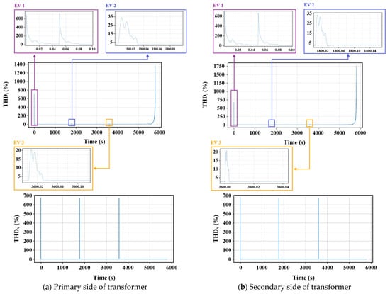 The THDi displays pronounced spikes corresponding with each EV connection event. On both the primary and secondary sides, the THDi briefly exceeds 1000% during the initial few seconds of each charging phase. These spikes result from the activation of power electronic converters, notably the inrush currents and switching transients associated with rectifiers and DC–DC converters. Nevertheless, THDi values stabilize shortly after each transition, decreasing to below 5% during steady-state charging. This demonstrates that harmonic filtering systems and circuit design effectively attenuate distortion following transients. The THDv remains consistently low—under 1.25%—throughout the process, with minor transient fluctuations that do not compromise system stability. This indicates that while charging dynamics introduce current harmonics, they do not significantly propagate into the voltage waveform due to system impedance and filtering.