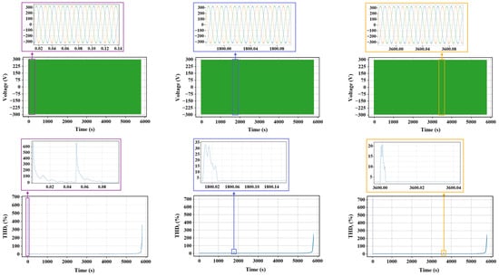 - THD behavior: The THDi showed brief spikes at charging initiation due to power-converter energization and then fell below 5% in the steady state. The THDv consistently remained < 1.5%, evidencing effective harmonic control.