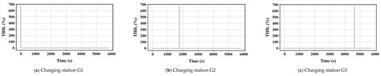 Figure 16 illustrates the power quality and electrical behavior at charging units G1, G2, and G3 during a varied EV-charging scenario, where three electric vehicles are charged at different times with distinct initial states of charge. The units are monitored for active power, current, voltage, and both current and voltage total harmonic distortion (THDi and THDv).